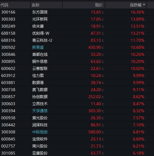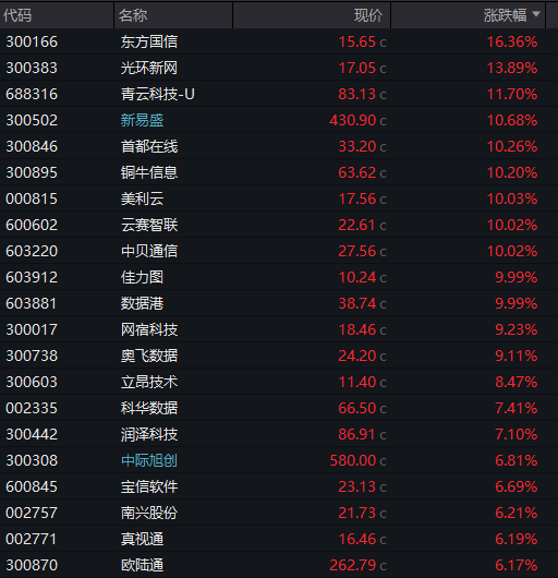 正在(zai)算力租赁概(gai)念和(he)AI算力概(gai)念股中(zhong),东(dong)方国信、光环新网、青云科技、首都正在(zai)线、铜牛信息等涨幅(fu)均(jun)超过10%。