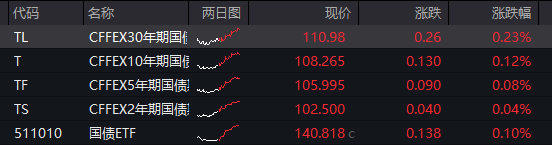 债市:国债期货全线上涨,截至发稿,30年期主力合约涨0.23%,10年期主力合约涨0.12%,5年期主力合约涨0.08%,2年期主力合约涨0.04%。