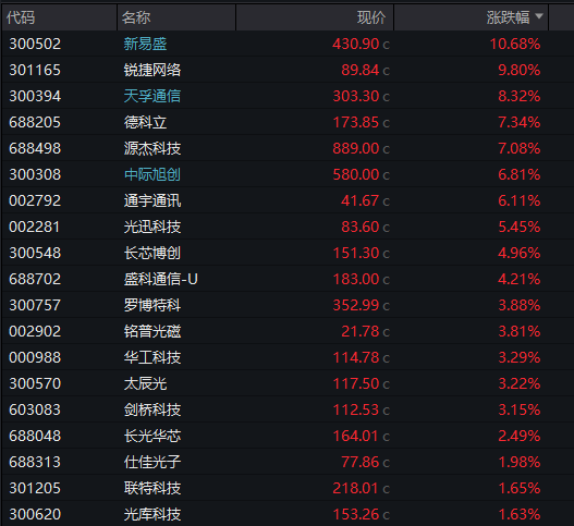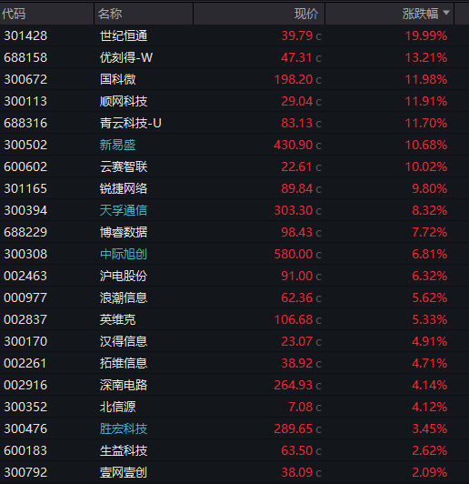 本(ben)日A股和(he)港(gang)股的AI产业链大爆发,算力硬件股、存储芯片、AI大模型、AI运用等周(zhou)全上涨。正在(zai)算力硬件股中(zhong),“易中(zhong)天”齐涨,新易盛涨超10%,锐捷收集、德科立、源杰科技等涨幅(fu)居前。