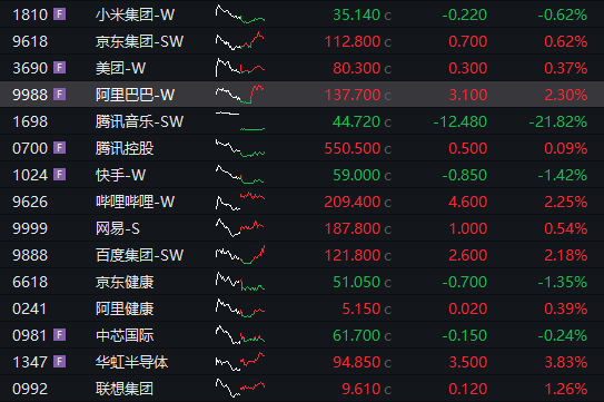 盘面上,中(zhong)通快递(di)涨逾7%,华虹半导体(ti)涨近4%,阿里巴巴、百度集团、哔哩哔哩涨逾2%。腾讯音(yin)乐(le)跌近22%,理想(xiang)汽车(che)跌逾6%,小鹏汽车(che)跌逾3%。
