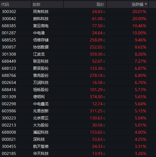 存储器概(gai)念股中(zhong),同有科技、朗科科技20CM涨停,复旦微(wei)电、中(zhong)电港(gang)等纷纷上涨,佰维存储续创历史新高。