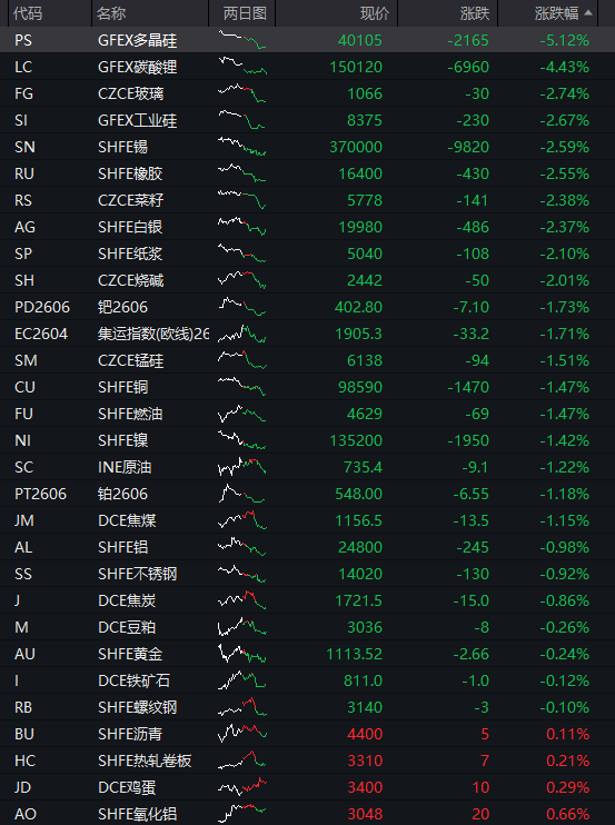 商品(pin):国内商品(pin)期货多数下(xia)跌,截至收盘,新能源材料跌幅(fu)居前,多晶硅跌5.12%;非金属建材悉数下(xia)跌,玻璃跌2.74%;基本(ben)金属多数下(xia)跌,沪(hu)锡跌2.59%;贵金属悉数下(xia)跌,沪(hu)银跌2.37%;黑色系(xi)多数下(xia)跌,硅铁跌2.19%;航运期货悉数下(xia)跌,集运指数(欧线)跌1.71%;能源品(pin)悉数下(xia)跌,燃(ran)油(you)跌1.47%。