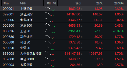 A股:截至发稿,沪(hu)指涨0.32%,深成指涨1.05%,创业板指涨2.02%。